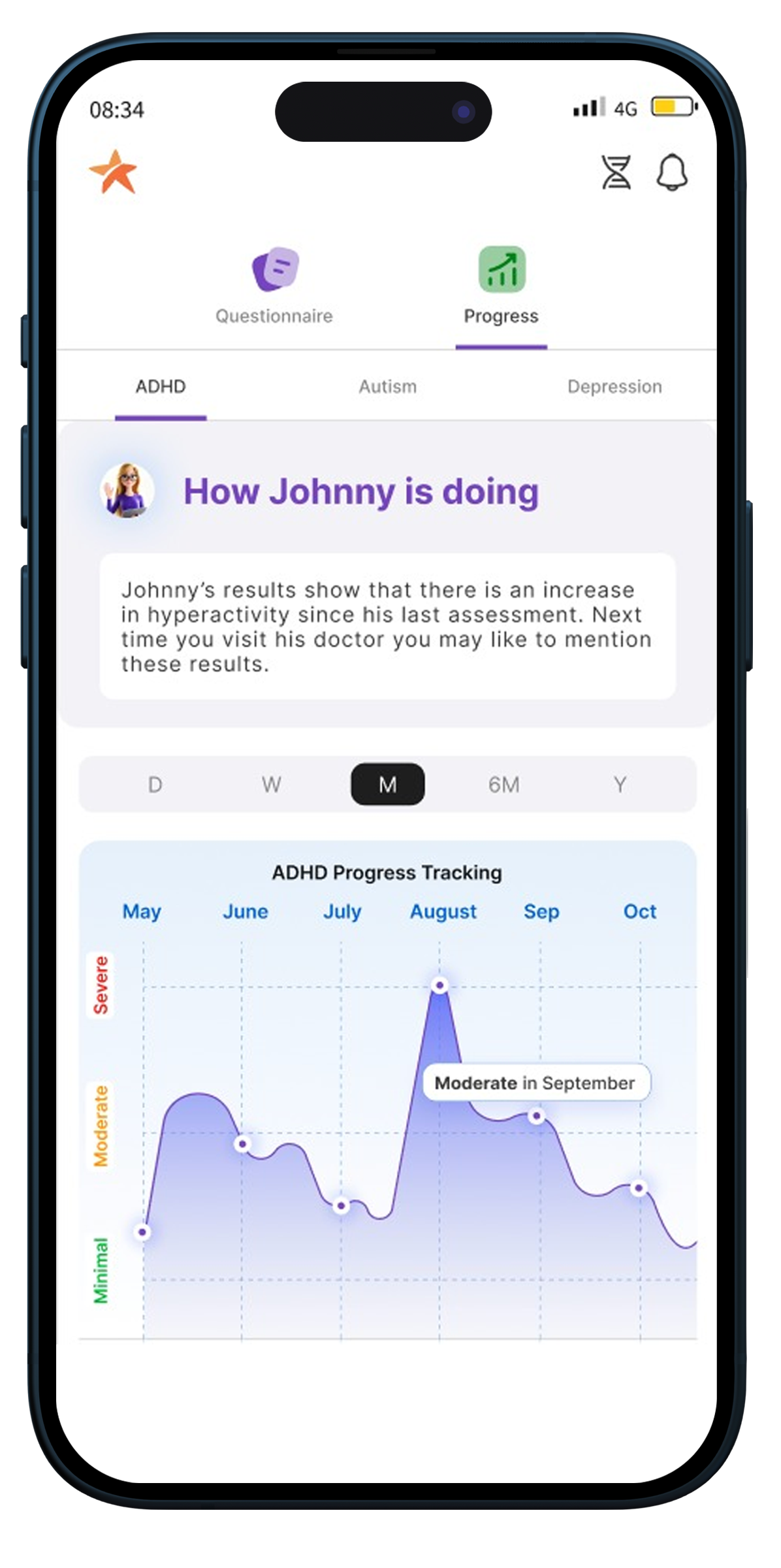 Parents complete condition-specific check-ins for ADHD, Autism, Epilepsy, Anxiety, or Depression.